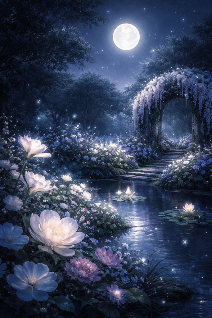 The Moon Bloom Sanctuary… Is a secret garden that awakens when the sun goes to sleep. By day, it rests quietly, hidden under the trees and soft shadows. By night, it blooms in whispers of silver and gold, with flowers that glow like tiny lanterns, petals that shimmer, and streams that sparkle as if sprinkled with starlight.